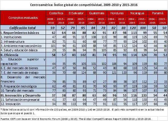 Al analizar las calificaciones obtenidas por los países centroamericanos en los informes de 2009-2010 y 2015-2016, se puede observar que, en los últimos cinco años, El Salvador y Honduras han perdido terreno frente al resto de países evaluados, cayendo 16 y 6 puestos en el ranking, respectivamente. Por el contrario, el resto de países han escalado entre 6 y 12 puestos.